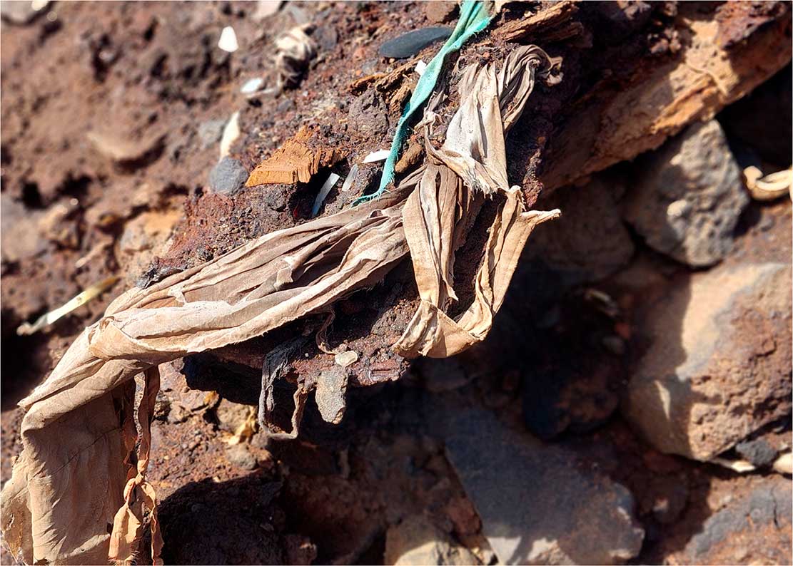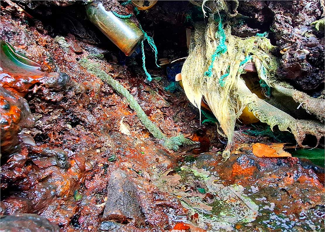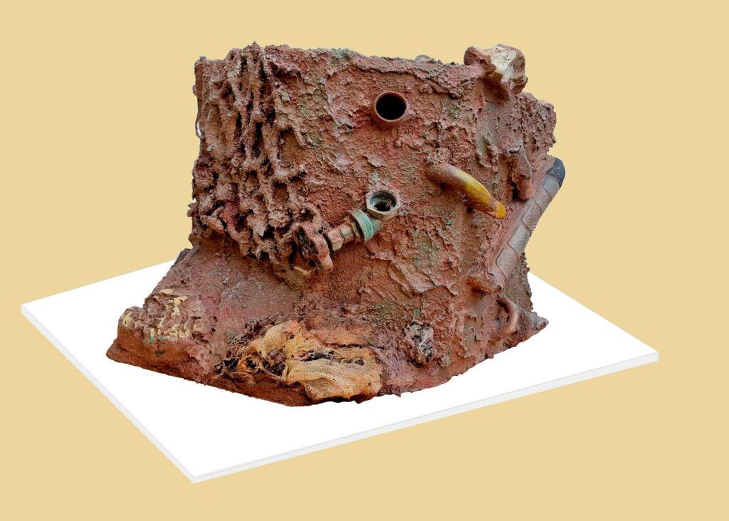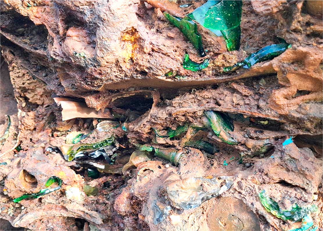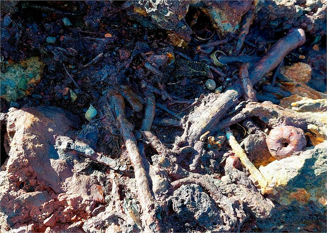 La sección «Capas del Presente» cierra el recorrido temático de Arqueologías del Antropoceno: fragmentos de un planeta herido. Compuesta por estratos fotográficos con residuos integrados, esta serie de imágenes establece la mirada fundamental del proyecto: la documentación de la huella humana como capa geológica.
